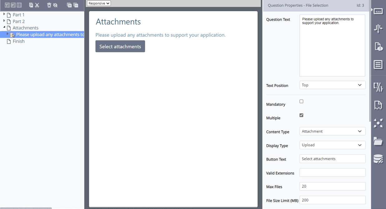 Once ‘Multiple’ is enabled on the File Selection question, you can control the number and size of files uploaded, as well as valid file extensions.