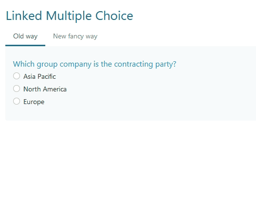 IQ15 introduces the ability to link several multiple choice questions by an id/group name to tie them together which would allow a single selection across multiple, Multiple Choice Questions.